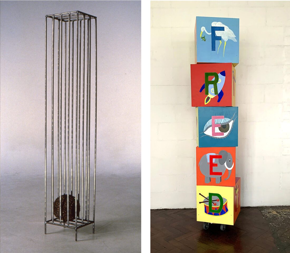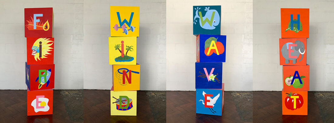 RIGHT: 'Alphabet Cubes- FREED' - 2022 – wood, acrylic paint – 200cm x 40cm x 40cm