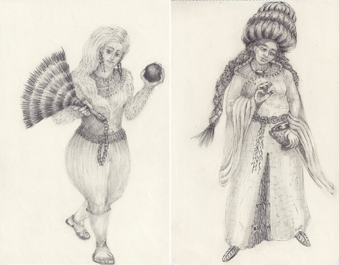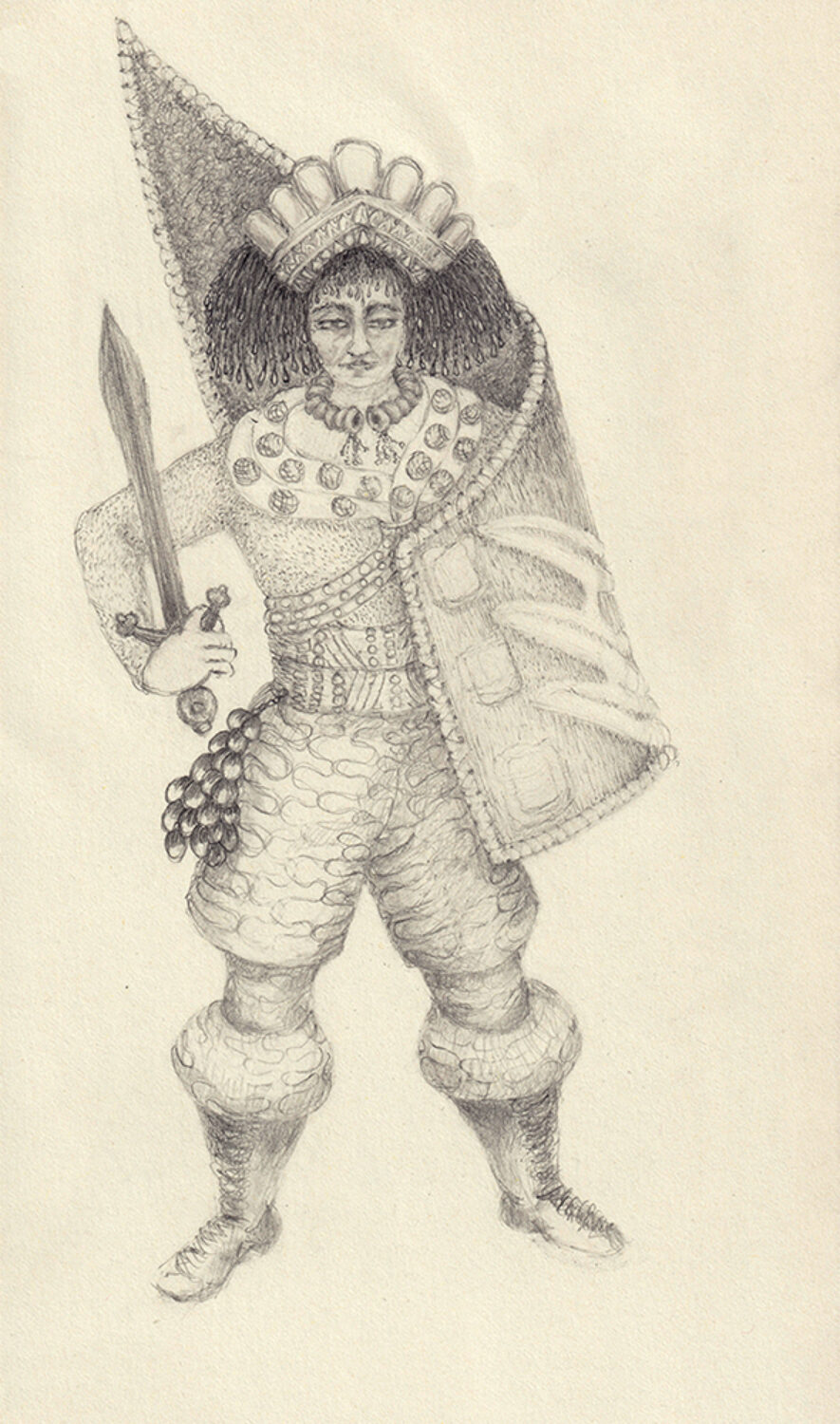 'Sentinel XII - preparatory drawing (Drawing-book 51, p.99)' Graphite on moleskine paper, 20.8cm x 12.8cm. Sentinel XII's weapons are her flutes that play mysterious tunes and spirit away malevolence. Final large drawing on show in digital exhibition Isolation (see below).