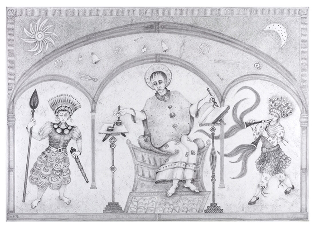 'Sentinel XII' Graphite on Awagami Kozo paper, 229cm x 97cm. Sentinel XII's weapons are her flutes that play mysterious tunes and spirit away malevolence. Preparatory drawing on show in The Lockdown Chronicles at hARTslane (see above).